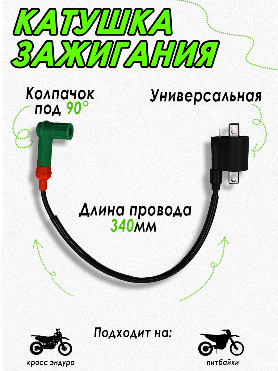 Катушка зажигания со свечным колпачком IC001 для двигателей мопедов, питбайков, скутеров, квадроциклов. Подходит на двигатели 4Т 50-160 см3 и другие. Цвет: Черно-Зеленый.